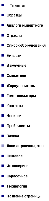 Линия производства кетчупов, соусов, хрена, майонезов Линия производства универсальная жидких, пастообразных продуктов Линия производства натуральных и концентрированных соков линия по изготовлению повидла линия по изготовлению сгущенного молока из сухого Линия по изготовлению сгущенного молока из цельного Линия по изготовлению сливочного масла Линия по производству джемов, подварок, варенья Линия по производству маргарина Линия по производству ряженки, кефира простокваши варенца, сметаны из сухого молока Линия по производству соусов, томатных паст, джемов линия по производству сыра линия по производству творога Линия по производству шоколадной глазури линия получения смеси мороженного Линия приготовления детского питания Линия приготовления карамельной крошки Линия приготовления соусов с кусочками Линия приготовления творога Линия приготовления фруктовых консервов Линия приготовления твердых и наливных маргаринов легких масел, паст, смесей жиров Линия производства вареных колбас Линия производства карамели Линия производства кваса Линия производства косметики, бытовой химии линия производства косметических кремов, гелей, мазей, шампуней, эмульсий, средств для мытья посуды и др. Линия производства легких масел и маргаринов с применением сухого молока и замороженных блоков масла Линия производства мясных консервов Линия производства настоек, наливок, ликеров Линия производства пастеризованного молока Линия производства стерилизованного молока Линия производства плиточного шоколада и какао-порошка Линия производства рыбных консервов Линия производства сгущенного молока линия производства сметаны и кисломолочных продуктов Линия производства соков линия производства твердых и наливных маргаринов, легких масел, паст, смесей различных жиров Линия производства твердых сыров из цельного молока Линия производства творога и творожных изделий из цельного молока Линия производства творога и творожных изделий из сухого молока Линия производства термизированного творога с наполнителями Линия производства фруктовых соков из концентрата Линия производства овощных соков Линия универсальная |