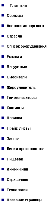 - Автоматизированная линия производства повидла; - Автоматизированная линия производства глазури, начинок, кремов; - Автоматические линии производства соусов, кетчупов, джемов; - Автоматические линии производства кисломолочных продуктов; - Автоматические линии производства универсальные; - Аппарат для созревания мяса; - Барабанный сушильный агрегат; - Бисерная мельница; - Вакуум-выпарная установка; - Вакуумная емкость из пищевой нержавеющей стали; - Вакуумные емкости; - Вакуумный массажер; - Ванна длительной пастеризации; - Ванна моечная; - Ванна пастеризационная; - Ванна сыродельная; - Ванна творожная; - Ванны моечные; - Ванны сливкосозревательные; - Варочная емкость; - Варочный котел; - Вертикальная темперирующая машина ; - Вертикальный кристаллизатор-маслообразователь; - Вотатор (переохладитель маргарина); - Выпарной аппарат; - Выпарные установки; - Глазировочная машина; - Гомогенизатор; - Гомогенизатор с рубашкой охлаждения (нагрева); - Деаэратор; - Дежа из нержавеющей стали; - Дежеопрокидыватель; - Дезодоратор; - Дисольвер; - Диспергатор; - Дистиллятор; - Дозатор; - Дражжеровочная машина; - Дробилка; - Емкости для хранения молока; - Емкости из пищевой нержавеющей стали; - Емкостное оборудование; - Емкость; - Емкость для отстоя масла; - Емкость для хранения растворов; - Емкость из пищевой нержавеющей стали; - Емкость универсальная; - Жироловушка; - Жиротопка; - Жироуловители; - Жироуловитель; - Заквасочник; - Измельчители; - Кожухотрубный теплообменник; - Котел вакуумный; - Котел варочный; - Котел для варки мяса; - Котел для варки субпродуктов; - Кристаллизатор отвердитель-гранулятор; - Куттер; - Ленточный смеситель; - Линия восстановления соков, молока; - Линия переработки молока и получения сметаны, творога, масла, сыра, и других кисломолочных продуктов; - Линия производства кетчупов, соусов, хрена, майонезов; - Линия производства универсальная жидких, пастообразных продуктов; - Линия производства натуральных и концентрированных соков; - Линия по изготовлению повидла; - Линия по изготовлению сгущенного молока из сухого; - Линия по изготовлению сгущенного молока из цельного; - Линия по изготовлению сливочного масла; - Линия по производству джемов, подварок, варенья; - Линия по производству маргарина; - Линия по производству ряженки, кефира простокваши варенца, сметаны из сухого молока; - Линия по производству соусов, томатных паст, джемов; - Линия по производству сыра; - Линия по производству творога; - Линия по производству шоколадной глазури; - Линия получения смеси мороженного; - Линия приготовления детского питания; - Линия приготовления карамельной крошки; - Линия приготовления соусов с кусочками; - Линия приготовления творога; - Линия приготовления фруктовых консервов; - Линия приготовления твердых и наливных маргаринов легких масел, паст, смесей жиров; - Линия производства вареных колбас; - Линия производства карамели; - Линия производства кваса; - Линия производства косметики, бытовой химии; - Линия производства косметических кремов, гелей, мазей, шампуней, эмульсий, средств для мытья посуды и др.; - Линия производства легких масел и маргаринов с применением сухого молока и замороженных блоков масла; - Линия производства мясных консервов; - Линия производства настоек, наливок, ликеров; - Линия производства пастеризованного молока; - Линия производства стерил
